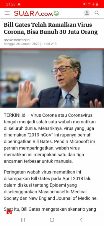 Di tahun 2018 Bill Gates (orang terkaya di dunia) pernah memprediksi akan suatu bahaya serangan virus. Tapi itu tidaklah aneh atau menakjubkan, sebab dengan kekayaannya dan luasnya jaringan dengan suport data-data dari berbagai dunia yang dia tahu, cukup beralasan Bill Gates mampu menganalisa akan bahaya virus ini yang kelak mengancam dunia.