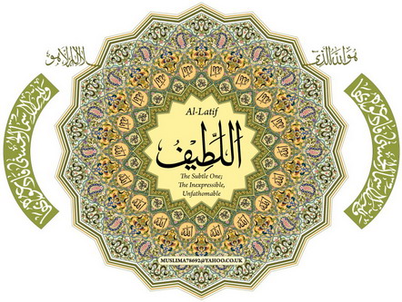 Asma Allah : Al Lathif (Yang Maha Lembut/Maha Halus) artinya DIA adalah Tuhan yang bersikap lembut kepada hamba-hambaNYA pada semua hal yang telah ditakdirkan dan Dia mengetahui semua perkara yang tersembunyi. DIA-lah yang maha mengasihi semua umat-Nya dan mengetahui perkara sampai sekecil-kecilnya.