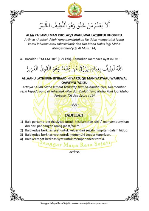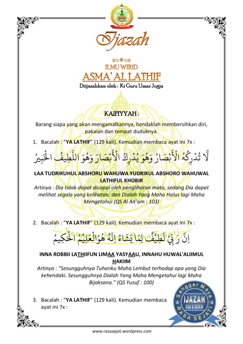 Berikut ini saya berikan IJAZAH UMUM amalan ilmu Hikmah Asma Al Lathif khusus untuk anda para pembaca blog Rasasejati. Kemudian ucapkanlah “QOBILTU” (saya terima (ijazahnya). Kemudian amalkanlah setiap hari dengan dawam/istiqomah. Semoga berkah dan bermanfaat.