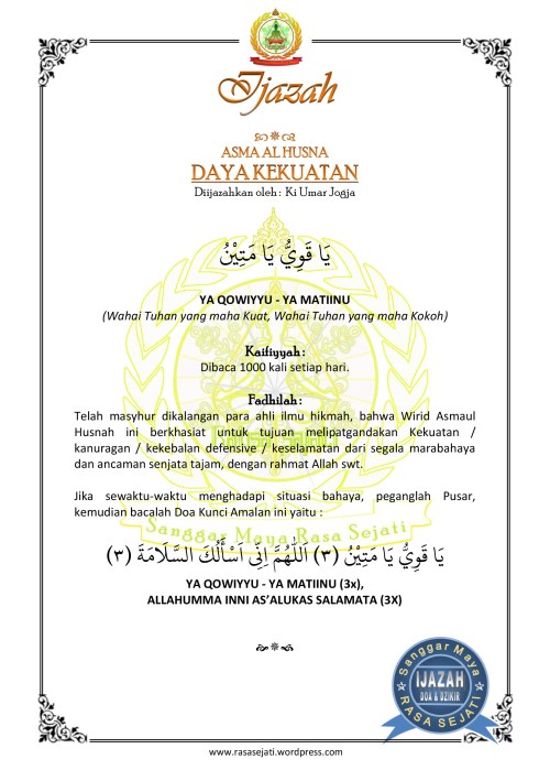 Mksh ki penjelasan..trz membaca YAA QAWIYUU YAA MATINU brp kali dan kapan saja ki…mhn penjelasanx lg…smga ki umar dan keluarga d rahmati..AMIN..WASALAM