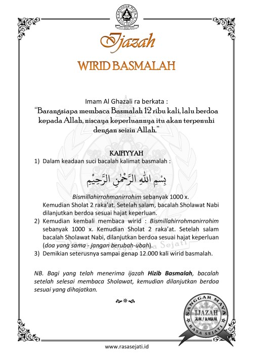 Berikut ini saya berikan IJAZAH UMUM amalan ilmu Hikmah dengan wasilah kalimah Basmalah, untuk berbagai macam hajat kebutuhan yang mendesak / hajat yang besar dan penting. Saat anda menerima ijazah ini, ucapkanlah: “QOBILTU” (saya terima (ijazahnya).