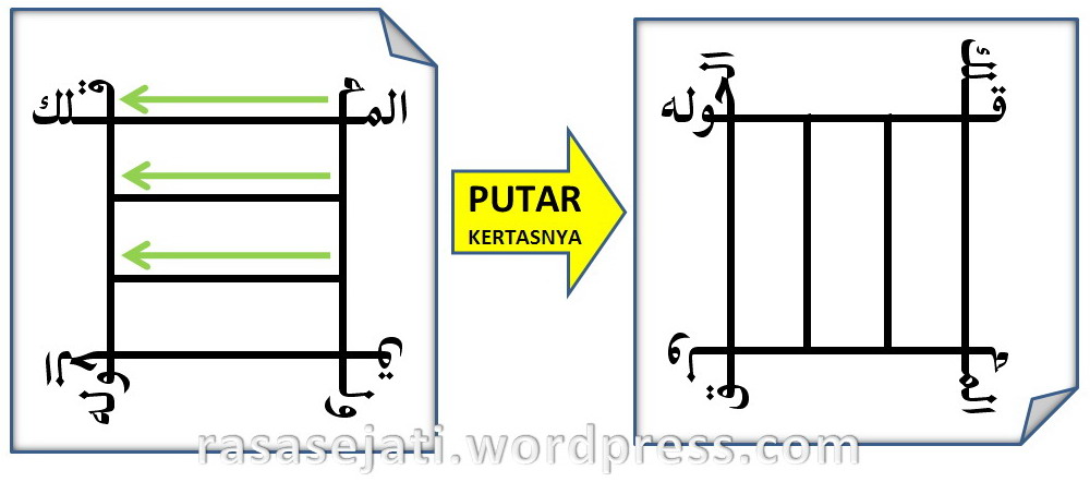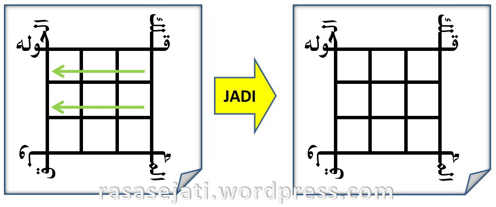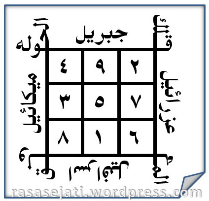 8. Setelah tabel wafaq persegi (wadah energi) telah jadi, kemudian baru ditulis hisab Asma Suci atau angka-angkanya dalam table. Urutan penulisannya mengikuti kaidah wafaq yaitu :