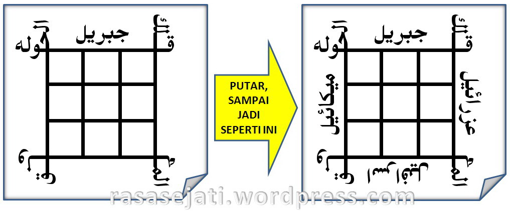 Kemudian disekelilingnya terdapat tulisan 4 malaikat= Atas : Jibril, Kiri : Mikail, Bawah : isrofil, Kanan : Izroil