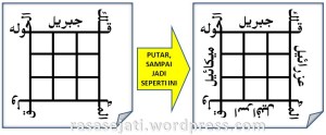 7. Lalu tuliskan 4 nama malaikat pada sekeliling sisi table. Dengan urutan sebagai berikut: pertama sisi Atas : Jibril, Kiri : Mikail, Bawah : isrofil, Kanan : Izroil. INGAT yang diputar adalah kertasnya :